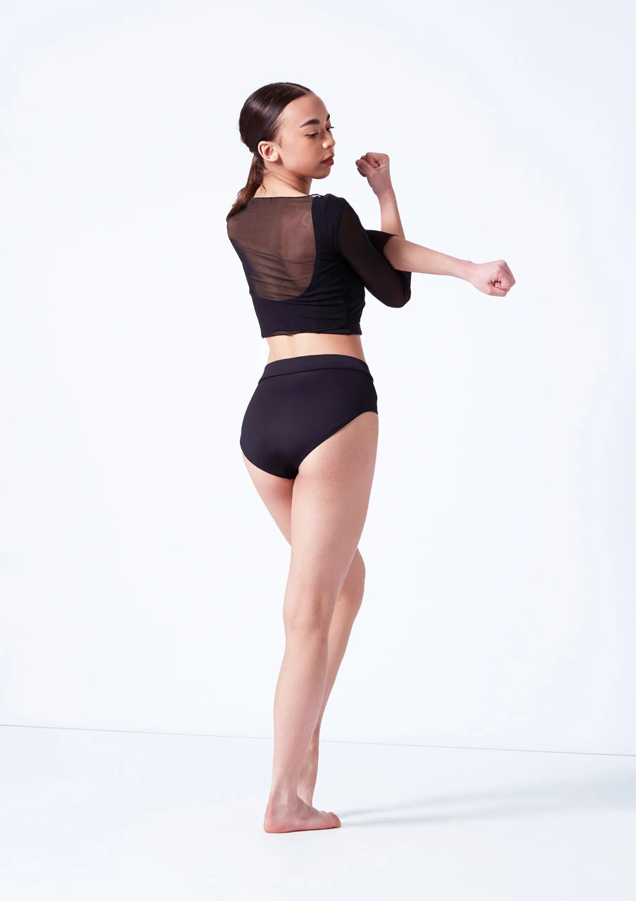 Elevate layering in the studio in this lovely mesh crop top. Wear it over your leotard and add a matching skirt. Featuring 3/4 length sleeves and a scooping neckline.
