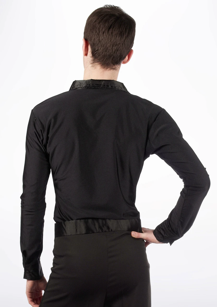 New to the Move Dancewear dancesport range, a men’s full body latin shirt with satin contrast collar and cuffs, and shiny stretch material body. The cuffs have a button fastening and cuff link option.