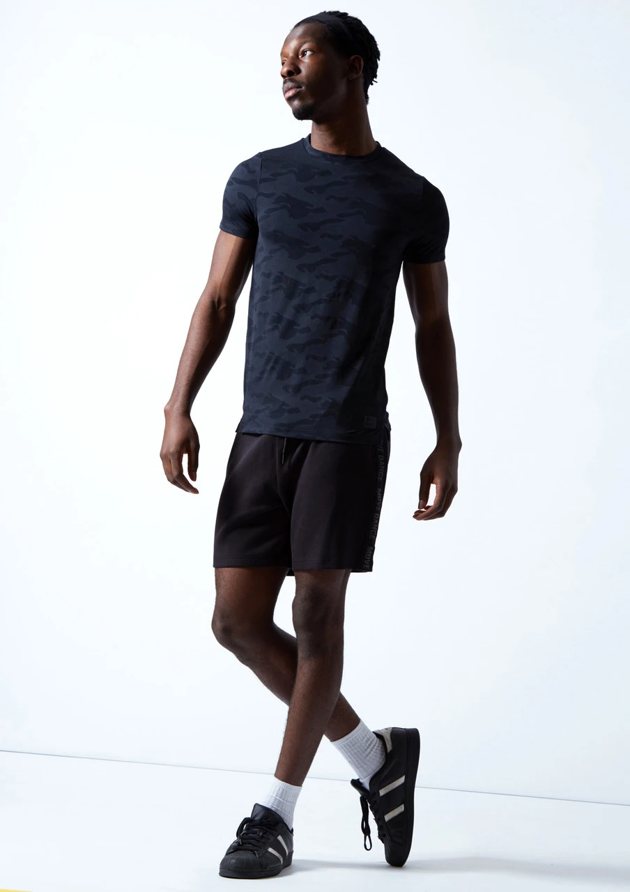 Stay cool in our camouflage print t shirt made with breathable, sweat wicking fabric. This slim fit tee features a round neckline and Move Dance branding.