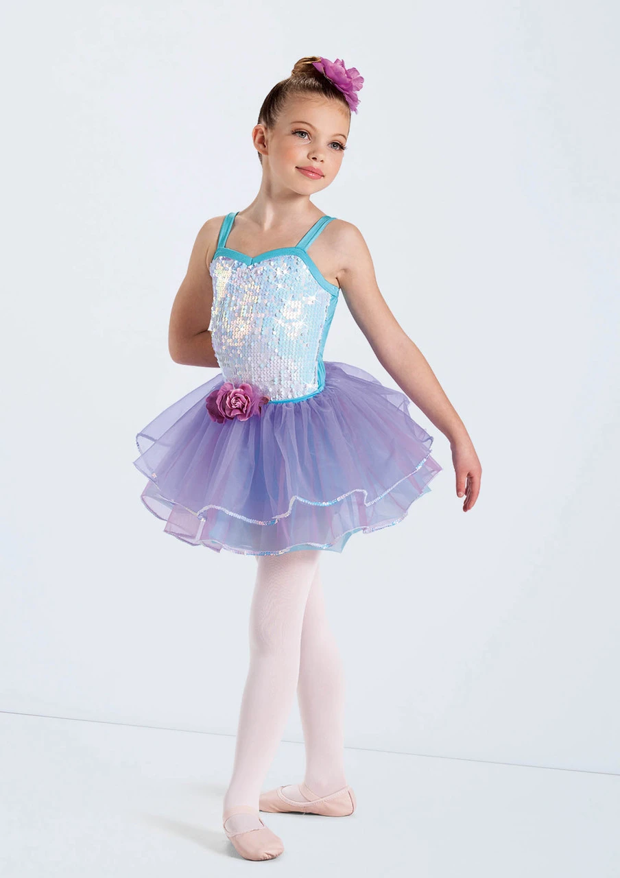 -Pull-on tricot tutu trimmed in iridescent sequins with floral spray at the waist