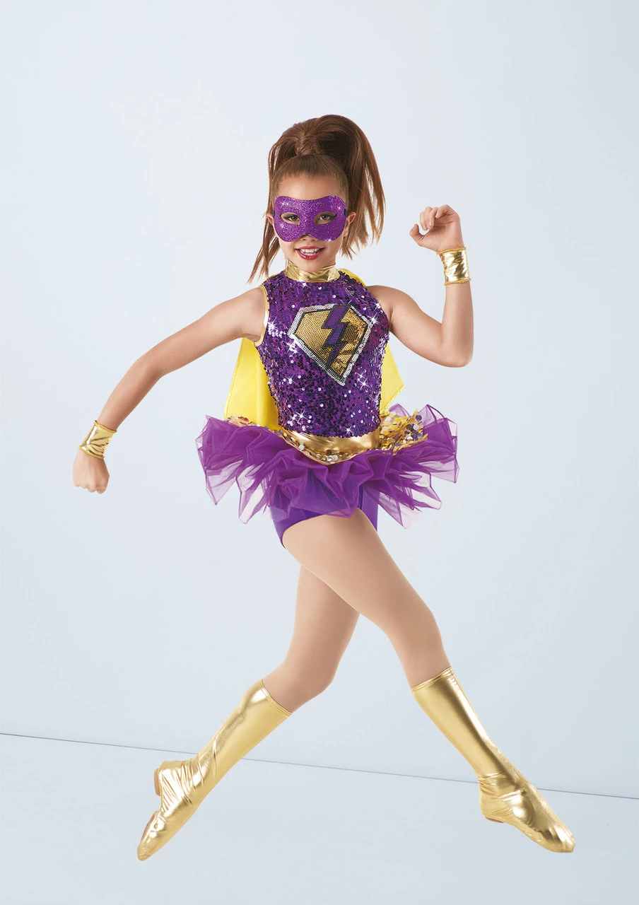 Save the day with sequins and sparkles in this superhero-inspired costume with an impressive cape. The shiny spandex neckline, cape and waistline contrasts with the ultra sequined bodice and top skirt. The bodice features a bold sequined lightening bolt which adds to the heroic look.