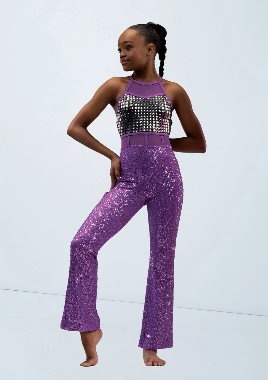 Jumpsuit has large silver sequin fully lined bodice