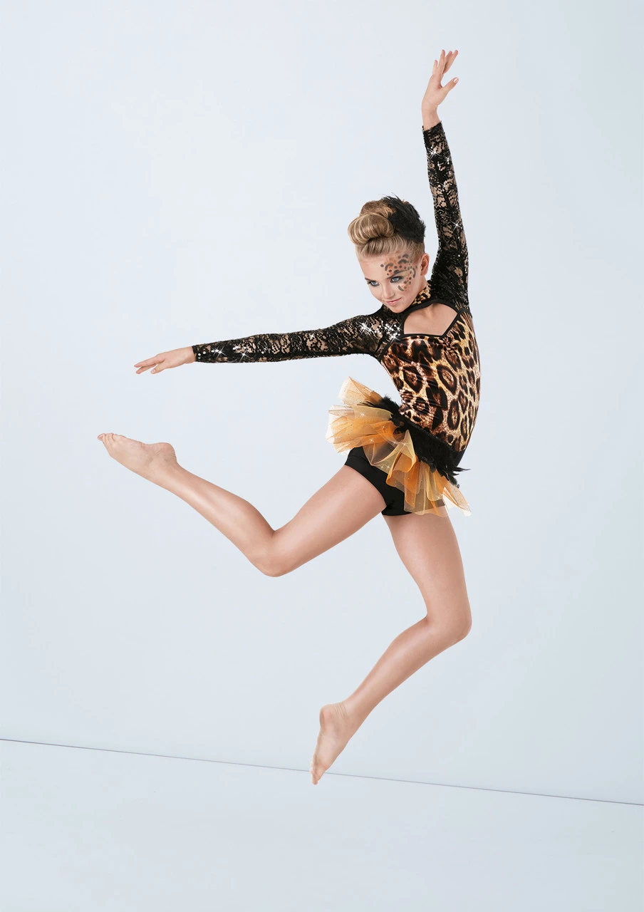 Bring out your wild side in this leopard print velvet bodice with sequin and feather detailing. The costume features an ombre side skirt with feathers which matches the included feather clip. The lace, sequined long sleeves of the biketard will sparkle under the stage lights and provides a flattering look along with the cut out on the front of the costume.